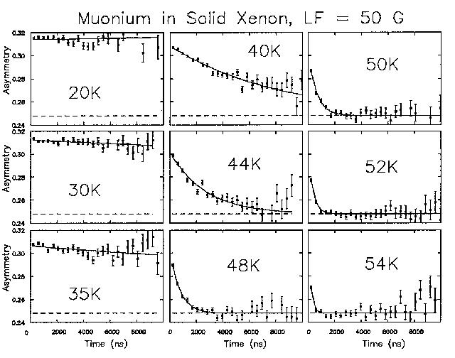 Mu Relaxation in s-Xe LF=50G A(t) vs T
